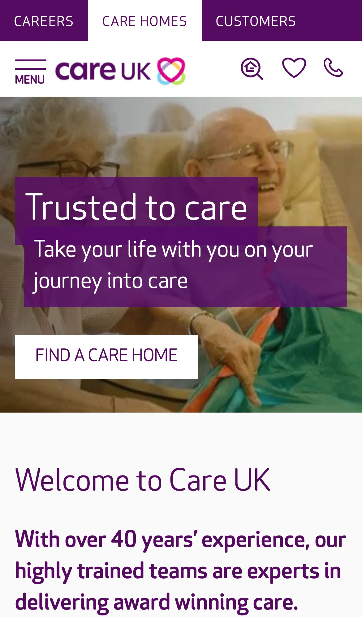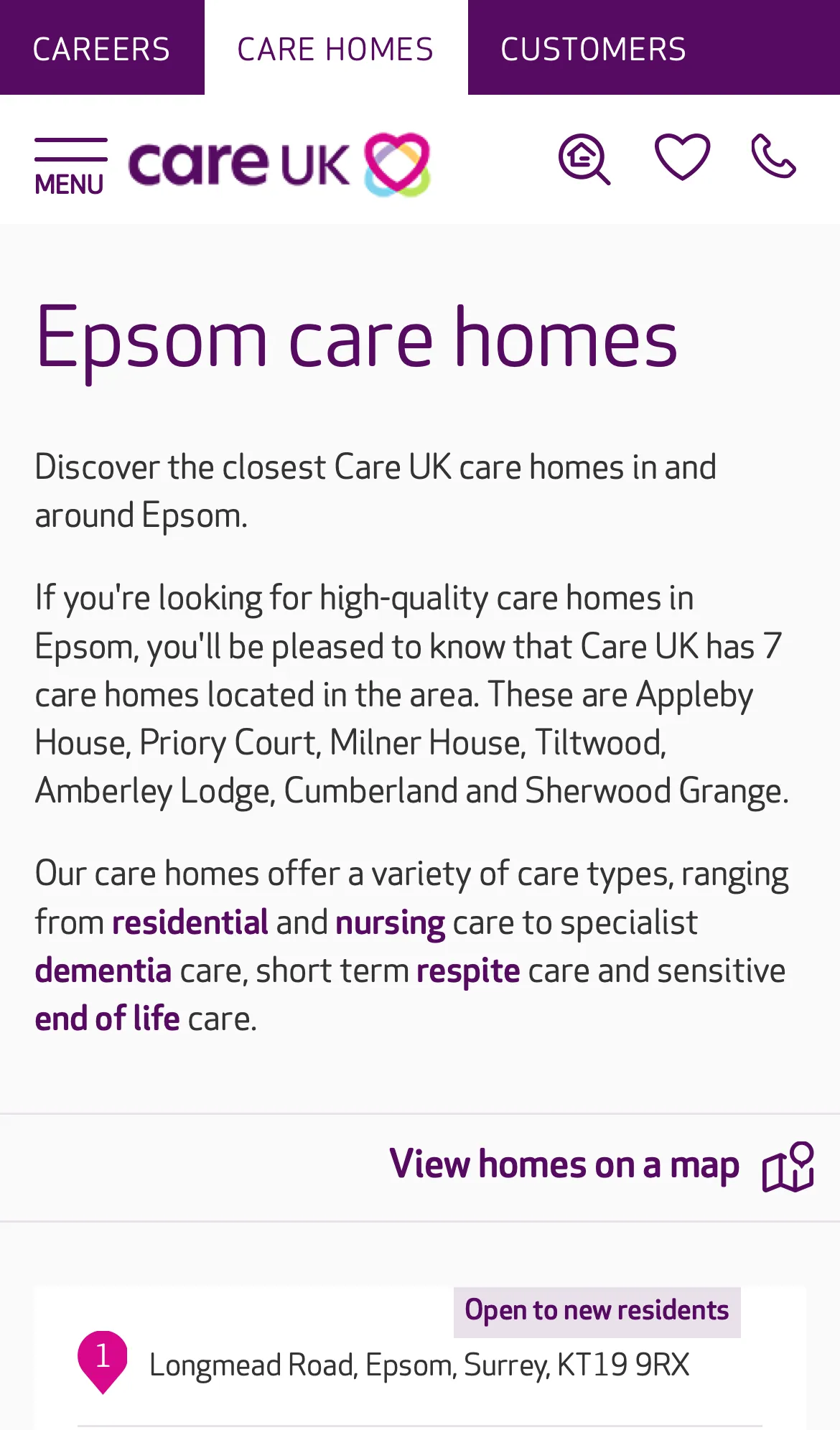 Someone searching "Epsom care home" lands here and decides whether Care UK serves the area, and which homes are nearby.