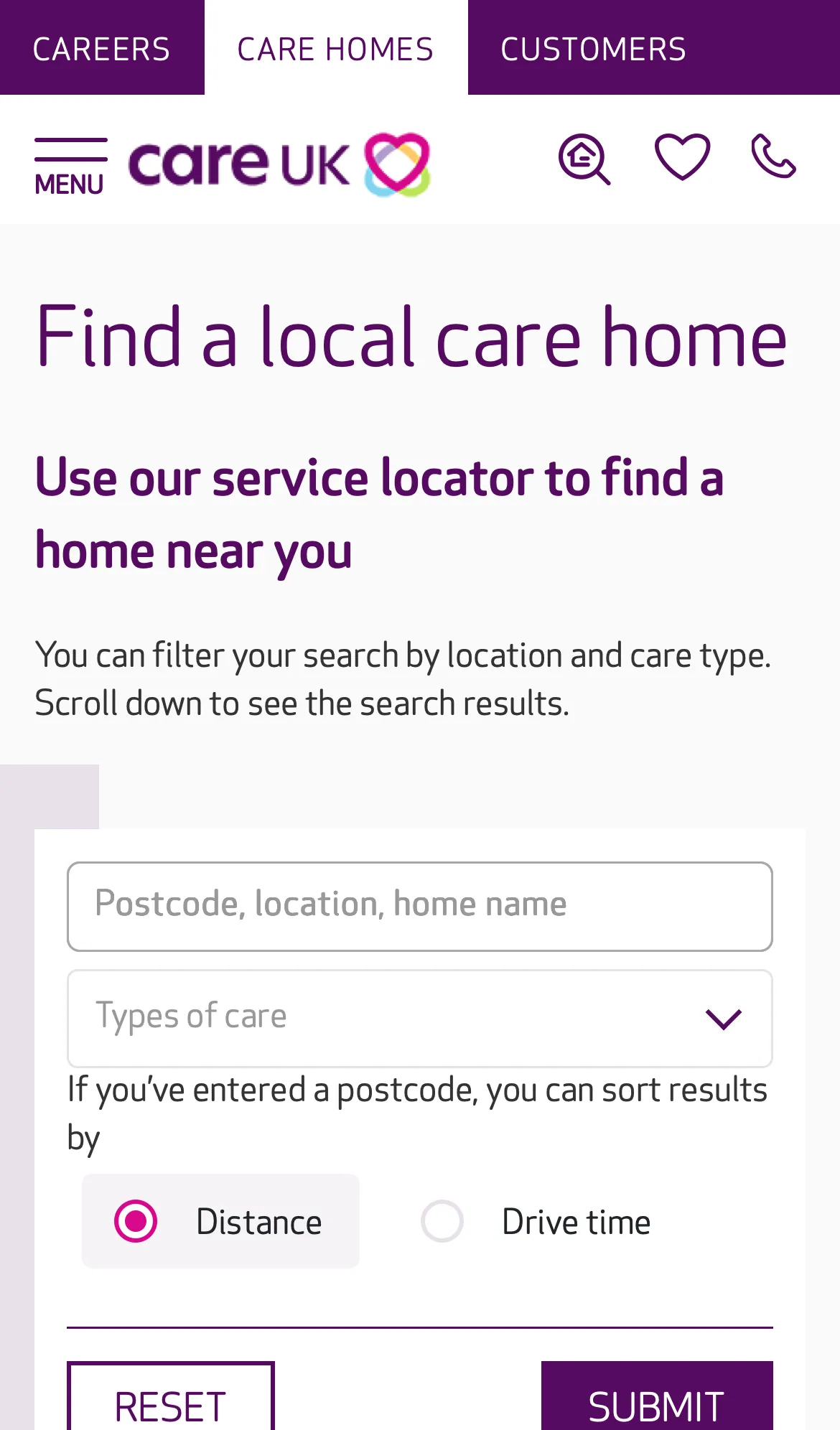 Find a Care UK home near a postcode, optionally filtered by care type, sortable by distance or drive time.